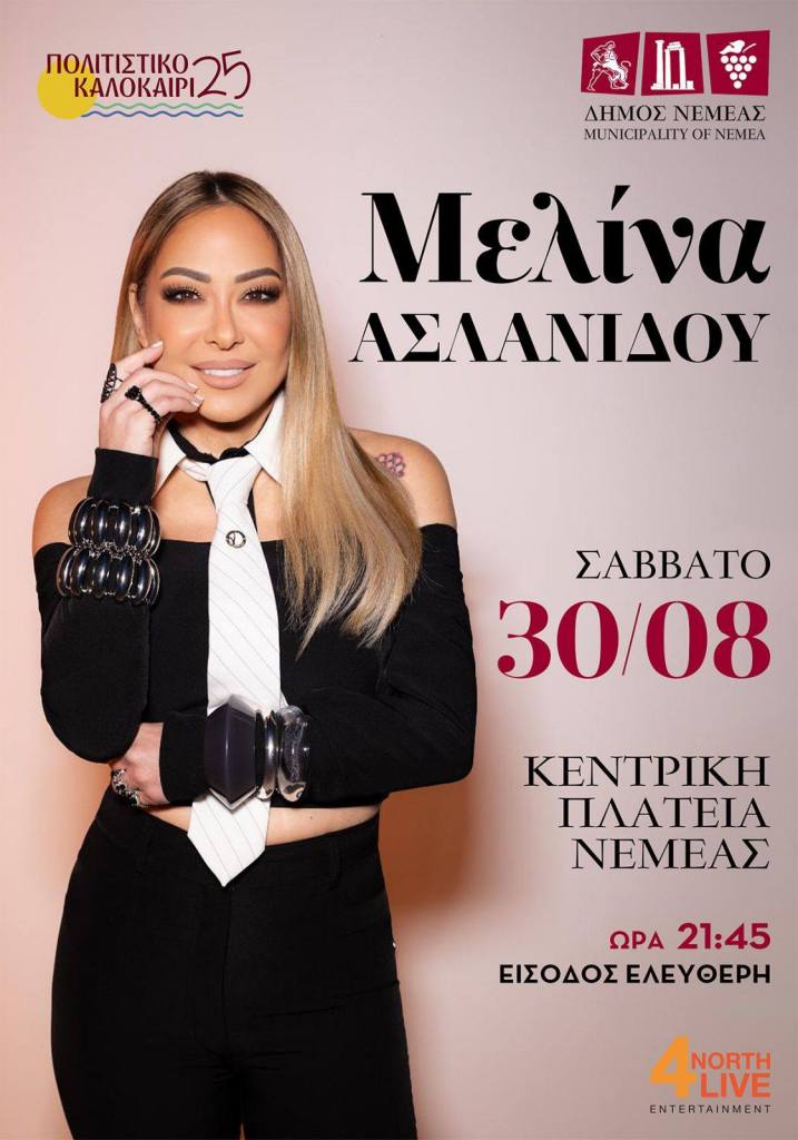 Η Μελίνα Ασλανίδου ανεβαίνει στη σκηνή της κεντρικής πλατείας Νεμέας και μας καλεί σε ένα ταξίδι γεμάτο συναίσθημα και τραγούδια που όλοι έχουμε αγαπήσει. Με τη μοναδική της φωνή και τη ζεστασιά της επικοινωνίας με το κοινό, η βραδιά προμηνύεται ως μία από τις κορυφαίες στιγμές του Πολιτιστικού Καλοκαιριού.