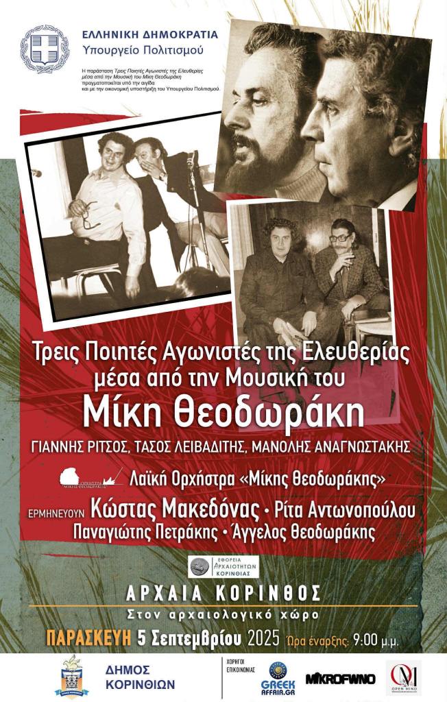 Η συναυλία στην Αρχαία Κορινθος για τα 100 χρόνια από τη γέννηση του Μίκη Θεοδωράκη, με την Ορχήστρα «Μίκης Θεοδωράκης» θα αποτελέσει μια γιορτή της ελληνικής μουσικής και της πλούσιας παγκόσμιας πολιτιστικής κληρονομιάς που άφησε πίσω του ο δημιουργός που διέδωσε παγκοσμίως τον ελληνικό πολιτισμό μέσα από τη μουσική του, τις ιδέες του και τους αγώνες του.