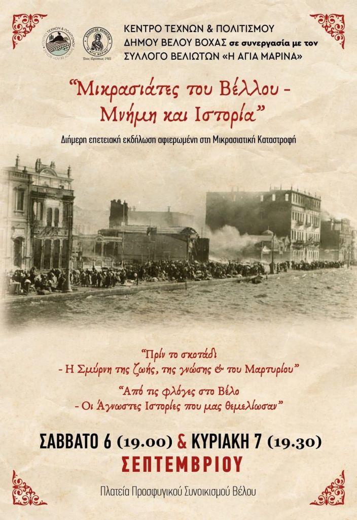 Η εκδήλωση είναι αφιερωμένη στη Μικρασιατική Καταστροφή και στους ανθρώπους που, μέσα από τις στάχτες της Σμύρνης, έφεραν τη ζωή, τη γνώση και τις παραδόσεις τους στο Βέλο, θεμελιώνοντας μια νέα κοινότητα. Δεν πρόκειται απλώς για μια τυπική αναφορά στο παρελθόν, αλλά για μια ζωντανή πράξη μνήμης και ευθύνης, που φιλοδοξεί να ενώσει τις φωνές των απογόνων με τις σιωπηλές ιστορίες των προγόνων.