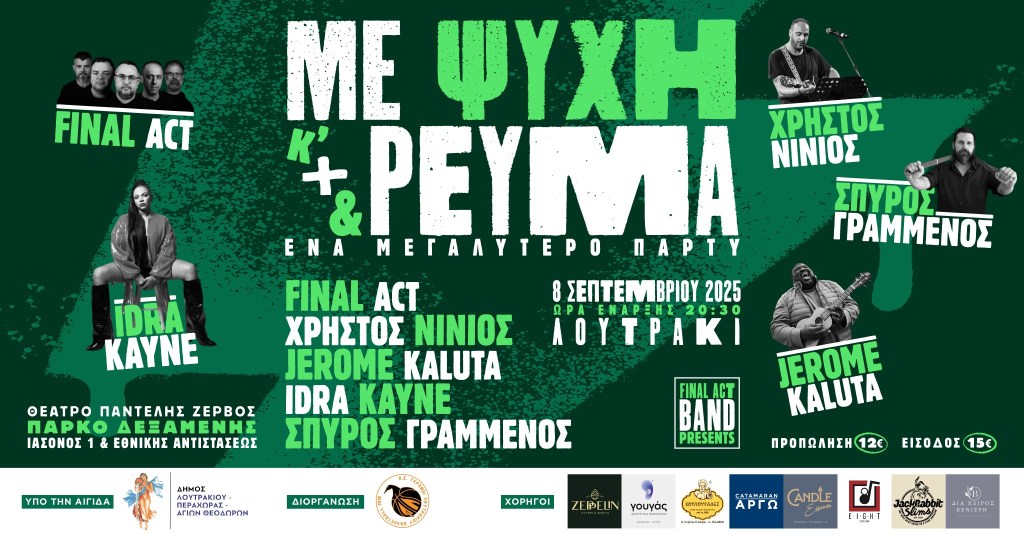 Η μουσική σκηνή του Λουτρακίου ετοιμάζεται να πάρει φωτιά το βράδυ της Δευτέρας 8 Σεπτεμβρίου στο ανοιχτό θέατρο Παντελής Ζερβός. Το μεγάλο συναυλιακό event με τίτλο «Ψυχή και Ρεύμα» υπόσχεται να χαρίσει στους θεατές μια αξέχαστη εμπειρία γεμάτη ενέργεια, ρυθμό και συναίσθημα.