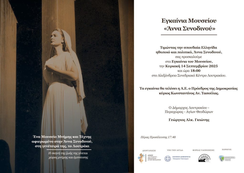 Μια ξεχωριστή στιγμή για τον πολιτισμό και την ιστορική μνήμη προετοιμάζει ο Δήμος Λουτρακίου – Περαχώρας – Αγίων Θεοδώρων με τα εγκαίνια του Μουσείου «Άννα Συνοδινού». Η εκδήλωση θα πραγματοποιηθεί την Κυριακή 14 Σεπτεμβρίου 2025 στις 18:00, στο Αλεξάνδρειο Συνεδριακό Κέντρο Λουτρακίου, με την παρουσία της Α.Ε. του Προέδρου της Δημοκρατίας, κ. Κωνσταντίνου Αν. Τασούλα, ο οποίος θα τελέσει τα εγκαίνια. Η προσέλευση των επισκεπτών θα πρέπει να ολοκληρωθεί έως τις 17:40.
