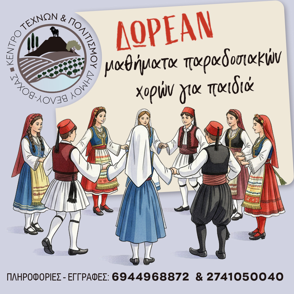 Ο Δήμος Βέλου – Βόχας ανακοινώνει τη λειτουργία δωρεάν τμημάτων παραδοσιακών χορών για παιδιά, δίνοντας την ευκαιρία στους μικρούς δημότες να έρθουν σε επαφή με τον πλούτο της ελληνικής παράδοσης.