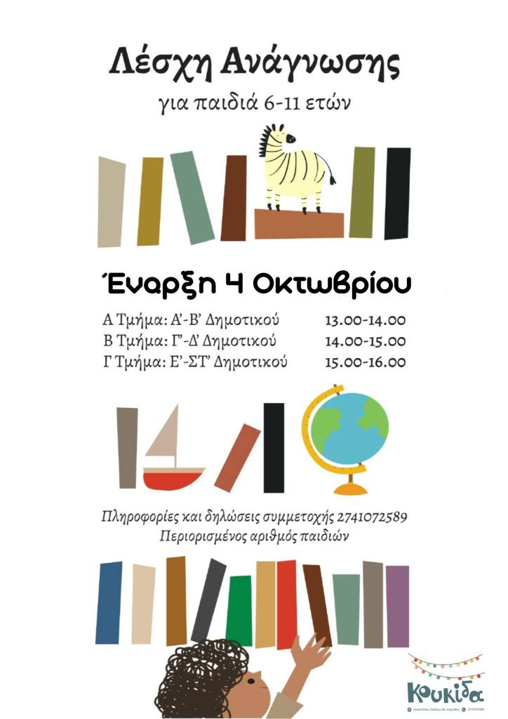 Οι εγγραφές πραγματοποιούνται στο βιβλιοπωλείο Κουκίδα ή τηλεφωνικά στο 2741 072589, ενώ οι θέσεις είναι περιορισμένες.