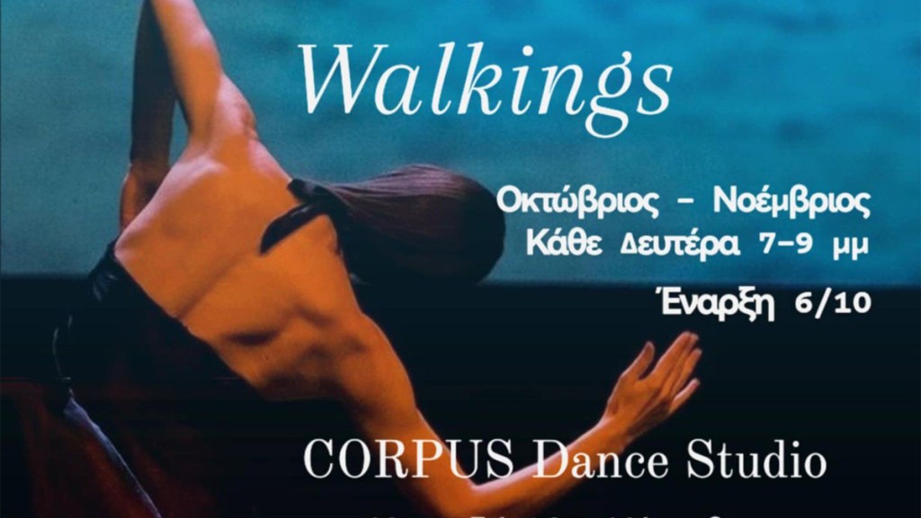 Το Corpus Dance Studio στην Κόρινθο παρουσιάζει το εισαγωγικό σεμινάριο Χοροθεάτρου με τίτλο «Walking», που θα πραγματοποιηθεί τους μήνες Οκτώβριο και Νοέμβριο. Το σεμινάριο είναι ανοιχτό σε εφήβους άνω των 16 ετών και ενήλικες, χωρίς περιορισμούς ή προϋποθέσεις, πέρα από τη διάθεση για εξερεύνηση και συμμετοχή.