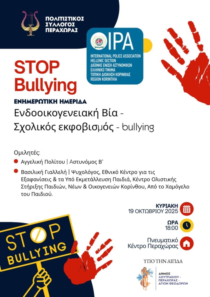 Ο Πολιτιστικός Σύλλογος Περαχώρας, σε συνεργασία με την International Police Association (IPA) – Ελληνικό Τμήμα, Τοπική Διοίκηση Κορινθίας, διοργανώνει μια ιδιαίτερα σημαντική ενημερωτική ημερίδα με τίτλο «STOP Bullying», αφιερωμένη στην ενδοοικογενειακή βία και τον σχολικό εκφοβισμό.