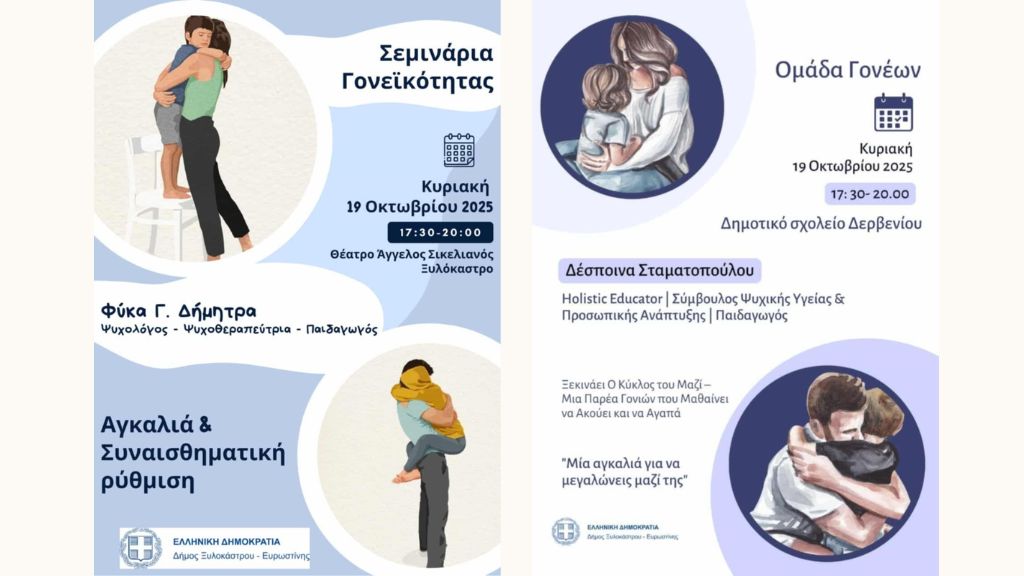 Ο Δήμος Ξυλοκάστρου – Ευρωστίνης ξεκινά τη νέα περίοδο λειτουργίας των Σχολών Γονέων με δύο ξεχωριστές δράσεις που εστιάζουν στην υποστήριξη των γονέων και τη σημασία της συναισθηματικής σύνδεσης μέσα στην οικογένεια.