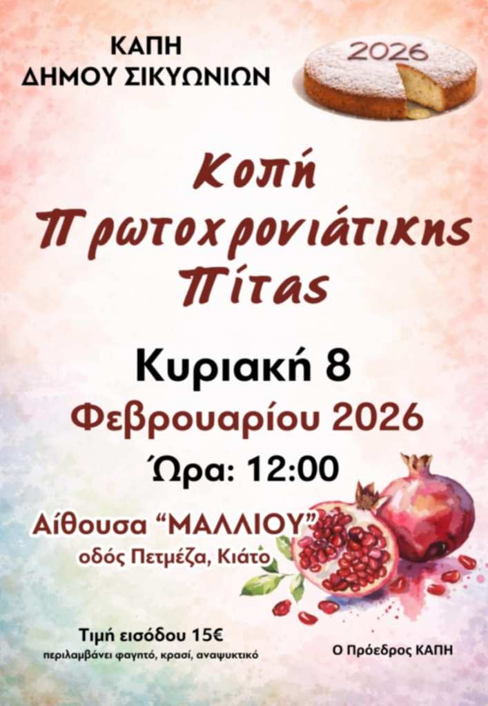 Η καθιερωμένη ετήσια κοπή πίτας του ΚΑΠΗ Σικυωνίων πλησιάζει, δίνοντας την ευκαιρία στα μέλη του να σμίξουν ξανά σε ένα ζεστό και εορταστικό κλίμα. Η εκδήλωση έχει προγραμματιστεί για την Κυριακή 8 Φεβρουαρίου, στις 12:00 το μεσημέρι, στην αίθουσα «Μαλλιού» στο Κιάτο. Είναι μια στιγμή που αναδεικνύει τη σημασία της κοινωνικής επαφής και της αλληλεγγύης ανάμεσα στους ανθρώπους της τρίτης ηλικίας της περιοχής μας, οι οποίοι αποτελούν αναπόσπαστο και ενεργό κομμάτι της τοπικής κοινωνίας.