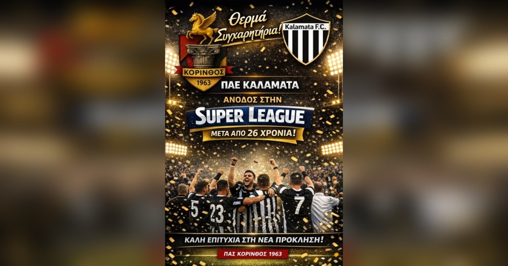 Μια κίνηση αθλητικής αναγνώρισης και ευγενούς άμιλλας πραγματοποίησε ο ΠΑΣ Κόρινθος, εκφράζοντας δημόσια τα συγχαρητήριά του προς την ΠΑΕ Καλαμάτα για την επίτευξη του μεγάλου στόχου της ανόδου στη Super League.