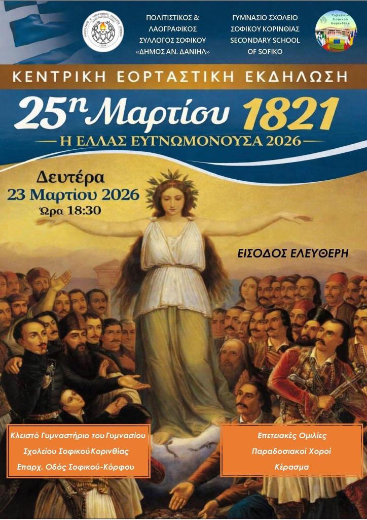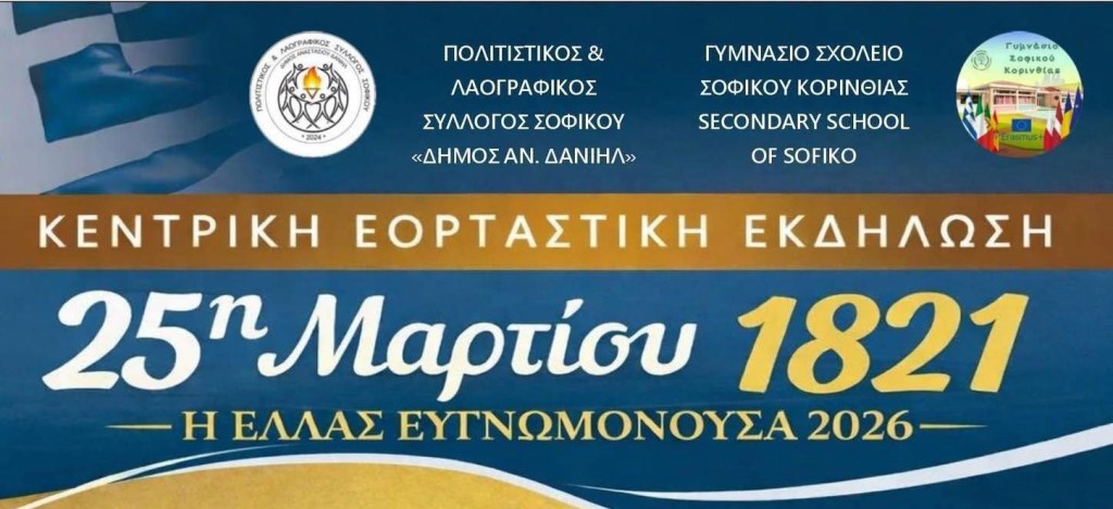 Με ιδιαίτερη λαμπρότητα και ιστορική κατάνυξη, το Σοφικό ετοιμάζεται να τιμήσει την επέτειο της Ελληνικής Επανάστασης. Ο Πολιτιστικός & Λαογραφικός Σύλλογος Σοφικού «Δήμος Αν. Δανιήλ», σε μια εξαιρετική συνδιοργάνωση με το Γυμνάσιο Σοφικού, προσκαλούν τους πολίτες στην εκδήλωση «Η ΕΛΛΑΣ ΕΥΓΝΩΜΟΝΟΥΣΑ 2026».
