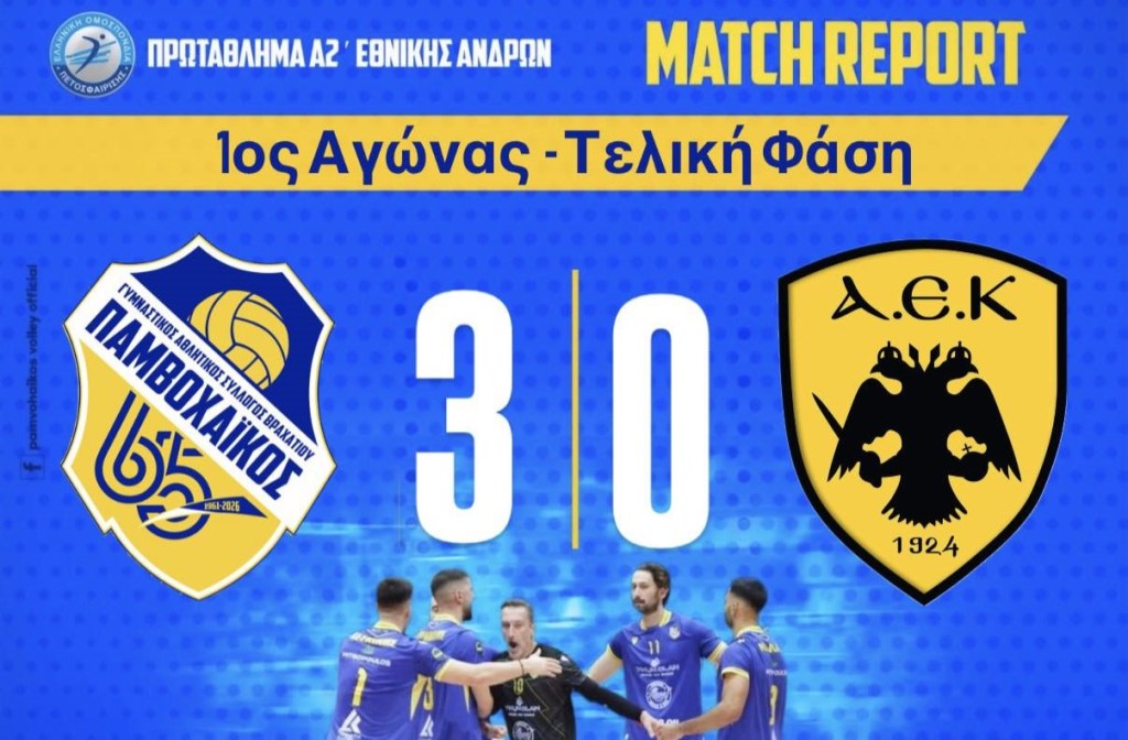 Ένα αποφασιστικό βήμα για την επιστροφή στις μεγάλες κατηγορίες του ελληνικού βόλεϊ πραγματοποίησε ο Παμβοχαϊκός. Στον πρώτο τελικό των πλέι οφ της Α2 Ανδρών, η ομάδα του Βραχατίου επικράτησε με 3-0 σετ (25-17, 28-26, 25-18) της ΑΕΚ, μετατρέποντας το κλειστό «Γ. Τριαντάφυλλος» σε ένα πραγματικό «κάστρο».
