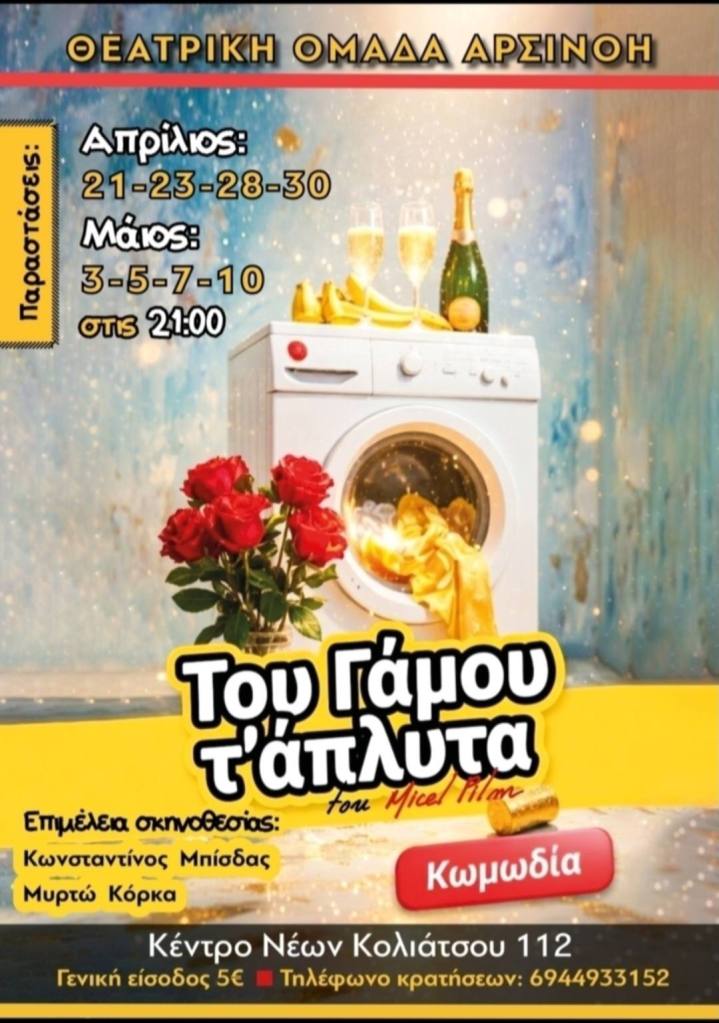 Μια ξεχωριστή επέτειο και μια πολυαναμενόμενη πρεμιέρα ετοιμάζει η Θεατρική Ομάδα «Αρσινόη», η οποία φέτος συμπληρώνει μια δεκαετία δημιουργικής παρουσίας στα πολιτιστικά δρώμενα της Κορινθίας. Με αφορμή αυτή τη γιορτή, η ομάδα ανεβάζει τη δεύτερη παραγωγή της για το 2026, την ξεκαρδιστική κωμωδία «Του Γάμου τ’ άπλυτα», η οποία κάνει πρεμιέρα αύριο, Τρίτη 21 Απριλίου. Υπό την επιμέλεια και τη σκηνοθεσία του Κωνσταντίνου Μπίσδα και της Μυρτώς Κόρκα, η παράσταση υπόσχεται άφθονο γέλιο, φέρνοντας στη σκηνή τις «ιδιαίτερες» στιγμές της έγγαμης ζωής με τρόπο που μόνο μια δεμένη θεατρική ομάδα μπορεί να αποδώσει.