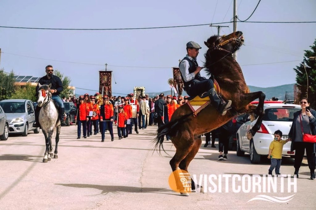 Ο ήχος των πετάλων στους δρόμους της πόλης και η εικόνα των στολισμένων αλόγων δημιουργούν μια μοναδική ατμόσφαιρα. Η πομπή, ακολουθώντας την καθιερωμένη διαδρομή, καταλήγει στην πλατεία, όπου η πίστη συναντά την παράδοση σε ένα θέαμα που αναδεικνύει την αυθεντικότητα της Κορινθίας.