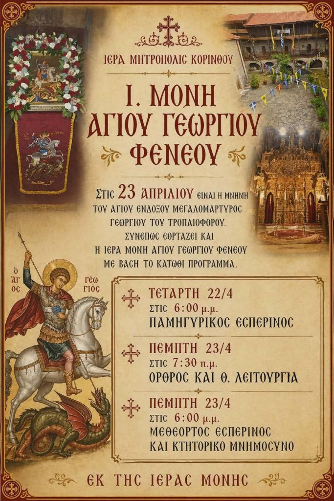 Στην καρδιά του ορεινού όγκου της Κορινθίας, εκεί που το φυσικό κάλλος συναντά την υψηλή πνευματικότητα, η Ιερά Μονή Αγίου Γεωργίου Φενεού ετοιμάζεται να υποδεχθεί τους πιστούς για τον εορτασμό της μνήμης του Αγίου Ενδόξου Μεγαλομάρτυρος Γεωργίου του Τροπαιοφόρου. Η Μονή, που αποτελεί το θρησκευτικό και ιστορικό «σήμα κατατεθέν» της περιοχής, έχει ανακοινώσει το επίσημο λατρευτικό πρόγραμμα για το διήμερο των εκδηλώσεων.